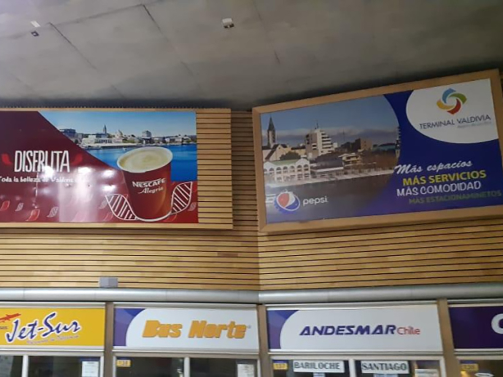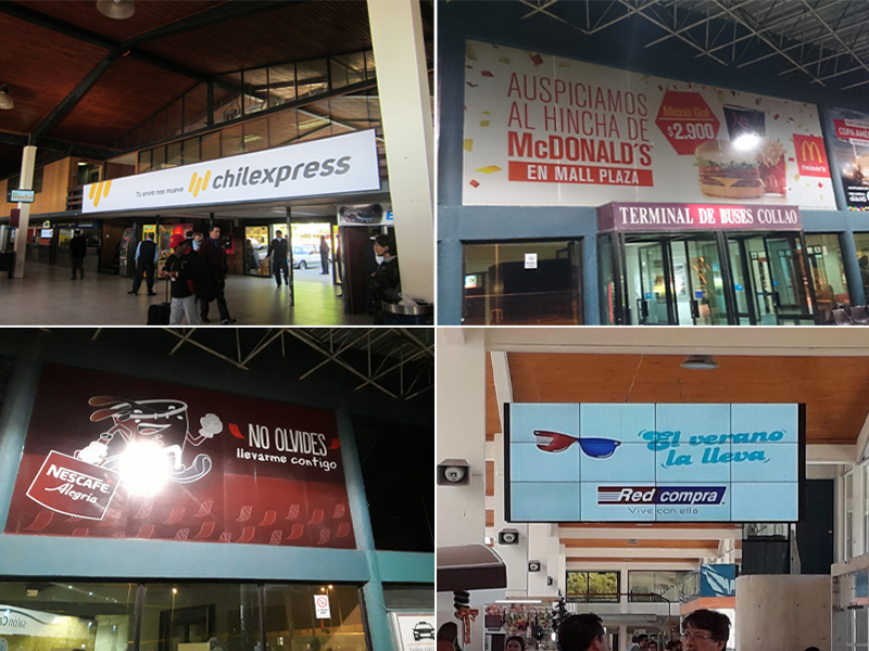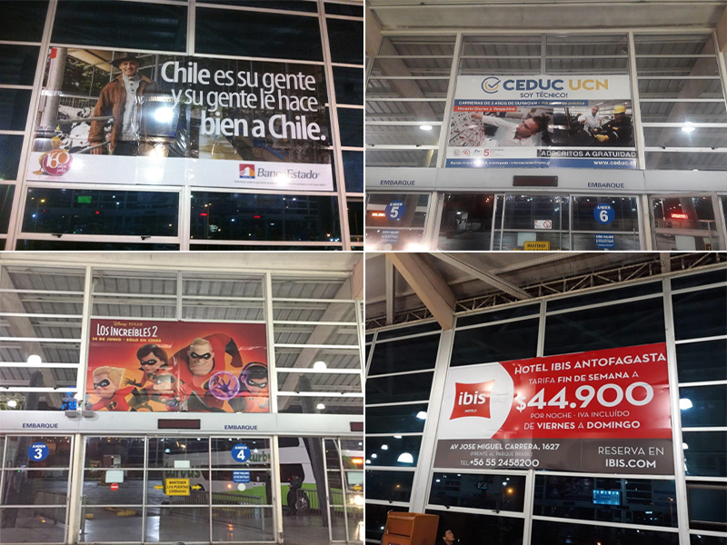 Pantalla Led, unipole exteriores, vallas exteriores, cajas de luz, ventanales, bastidores, carros portaequipajes, puentes de embarque, videowalls.